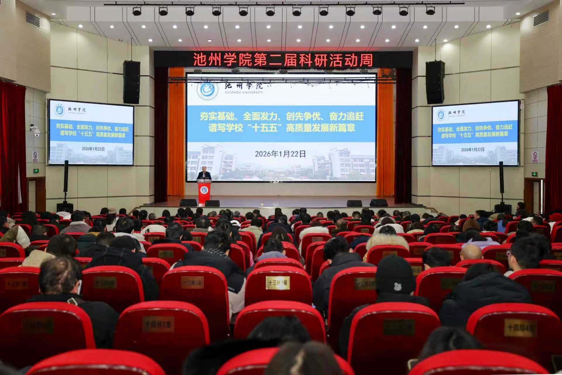 1月12日至22日,池州学院围绕科研工作在全校上下掀起系列热潮,聚焦“决胜申硕攻坚,强基提质增效”主题,成功举办第二届科研活动周。活动期间,11场学科建设深度研讨、72场高水平学术报告、260余本申报论证书专项审核、380余名博士及副高以上职称教师述职评议等系列活动密集开展,从顶层设计到基层落实多维发力,凝聚发展共识、明确攻坚路径,为学校申硕目标实现和“十五五”高质量发展筑牢基础。