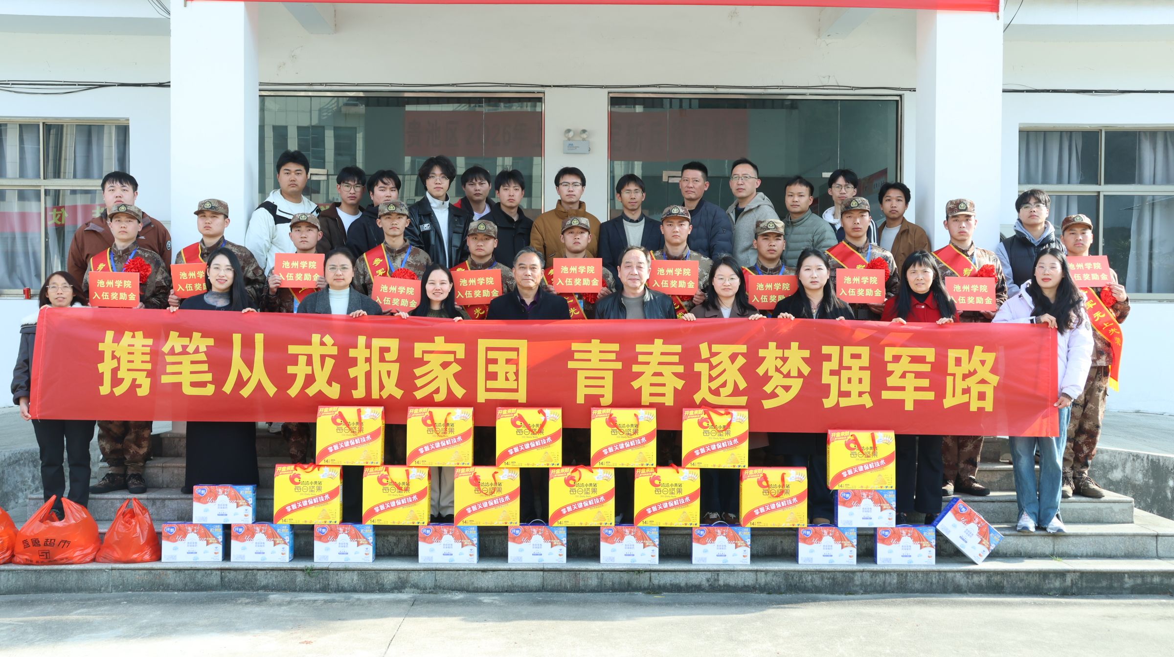 为强化入伍学生荣誉感与仪式感,鼓励青年学子携笔从戎报效祖国,3月13日,学校在贵池区民兵训练基地举行2026年上半年入伍预定兵学生慰问欢送活动。