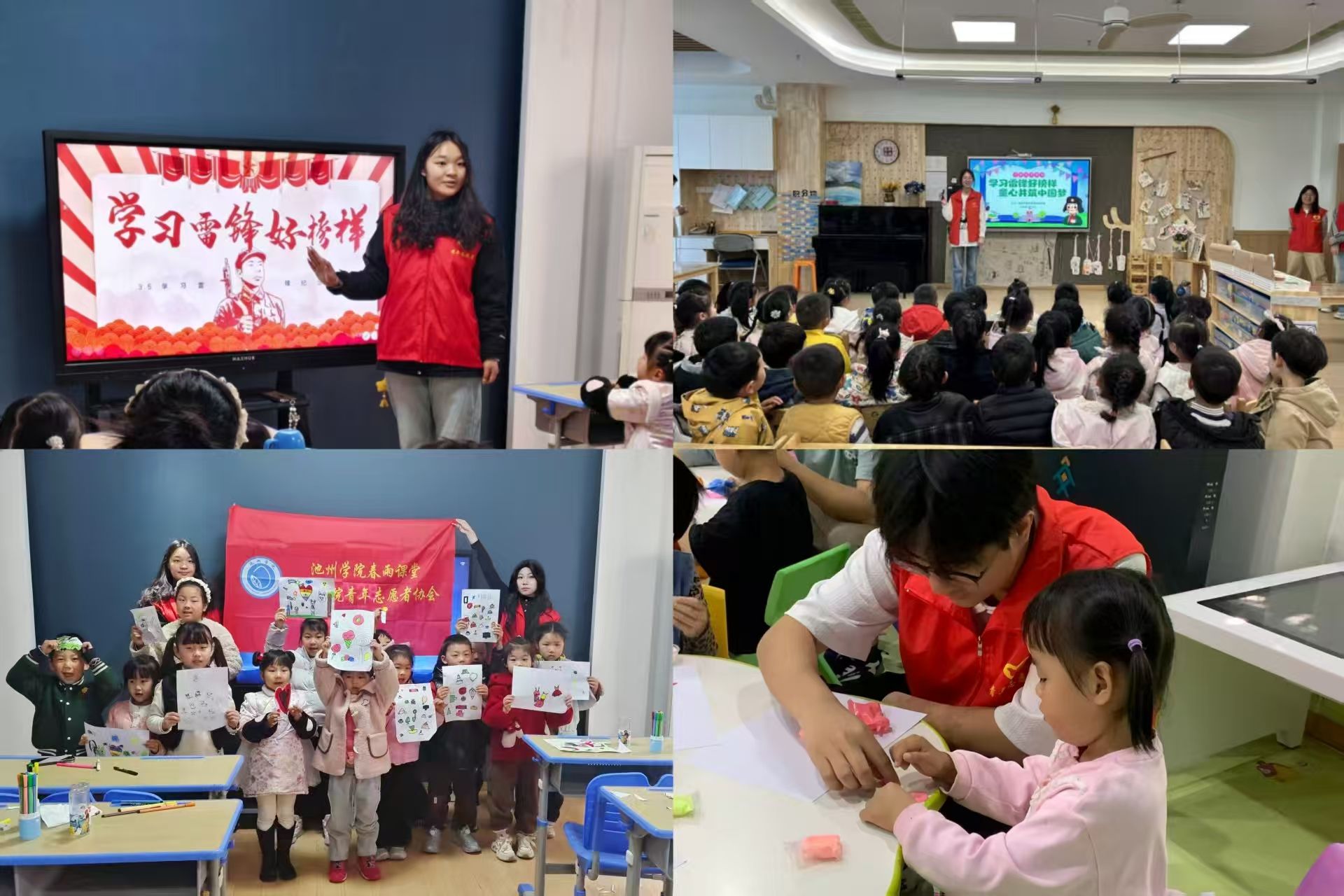 科普启智播撒科学与精神种子“春雨课堂”志愿服务队利用周末深入社区,面向6—8岁儿童开展爱心陪伴志愿服务活动。志愿者们精心开设火烈鸟水粉美术课程,科普动物知识与绘画技法,充分激发儿童的艺术感知力与创作想象力;同步开设雷锋精神主题教育课程,通过讲述雷锋事迹、分享志愿故事、互动交流讨论等形式,引导孩子发现身边善举,践行雷锋精神。此外,外国语学院组织志愿者赴池州市直幼儿教育集团,开展“学习雷锋好榜样 童心共筑中国梦”主题活动。志愿者们以PPT宣讲、趣味游戏等形式,结合专业特色引导幼儿用英语介绍作品,实现专业优势与幼儿启蒙教育深度融合,在童心深处播撒奉献、友善的精神种子。