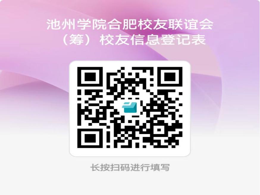 为全面了解合肥校友情况,现开展池州学院合肥校友信息登记工作。登记对象为学校办学各阶段(安徽劳动大学池州地区专科班、池州师范专科学校、池州工业学校、安徽省经贸学校、池州学院)在肥校友信息,凡在池州学院及其前身各个时期工作、学习、生活过的合肥校友,或在外地工作、学习的合肥籍校友,均可扫描下方二维码,填写《池州学院合肥校友信息登记表》(校友信息仅用于校友联络,严格保密,请放心填写)。