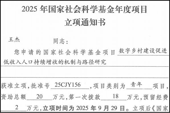 围绕这一问题,王杰在学术研究中创新性构建了“赋权—强能—增志”的理论框架,着力探索如何将农户信誉、传统技艺等“沉睡资源”转化为促进发展的“有效资本”,并通过计量模型与案例分析相结合的方式,增强研究的理论解释力与实践针对性。2025年国家社科基金项目“数字乡村建设促进低收入人口持续增收的机制与路径研究”的成功获批,正是他长期立足现实、持续深耕研究的成果体现。