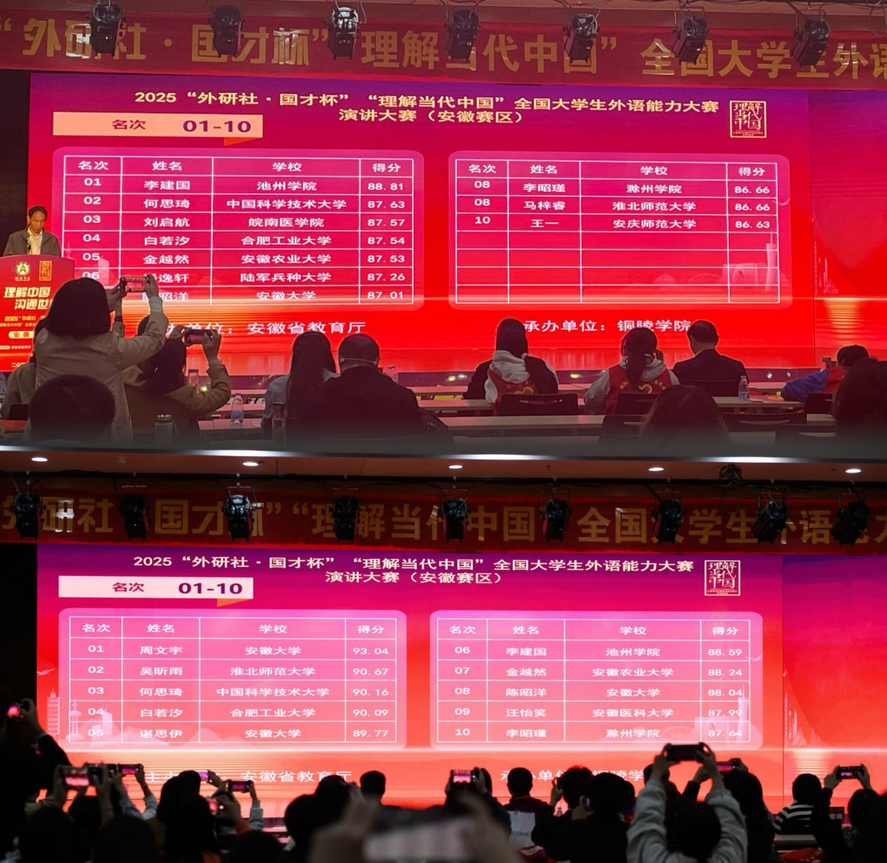 11月1日-2日,外研社“国才杯”“理解当代中国”全国大学生外语能力大赛(安徽赛区)演讲比赛圆满落幕。我校外国语学院24级英语1班李建国同学凭借扎实的语言功底、突出的赛场表现荣获一等奖,成功晋级国赛(指导教师:闻雯、梅琳、赵梦雨)。