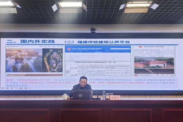 会上,我校文化产业管理专业石松平副教授作了题为《皖南传统村落民居多维数字化平台建设与创新研究》的专题报告。石松平在报告中提出了“村集体+合作社+平台”三位一体的租赁平台模式,为解决皖南传统村落文化资源活化难题提供了具有实践价值的创新方案。