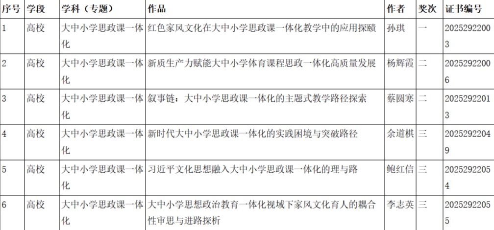 近日,安徽省2025年中小学教育教学论文暨大中小学思政课一体化建设专题论文评选结果揭晓,我校六位教师获奖,其中一等奖1项、二等奖2项、三等奖3项。获奖名单如下: