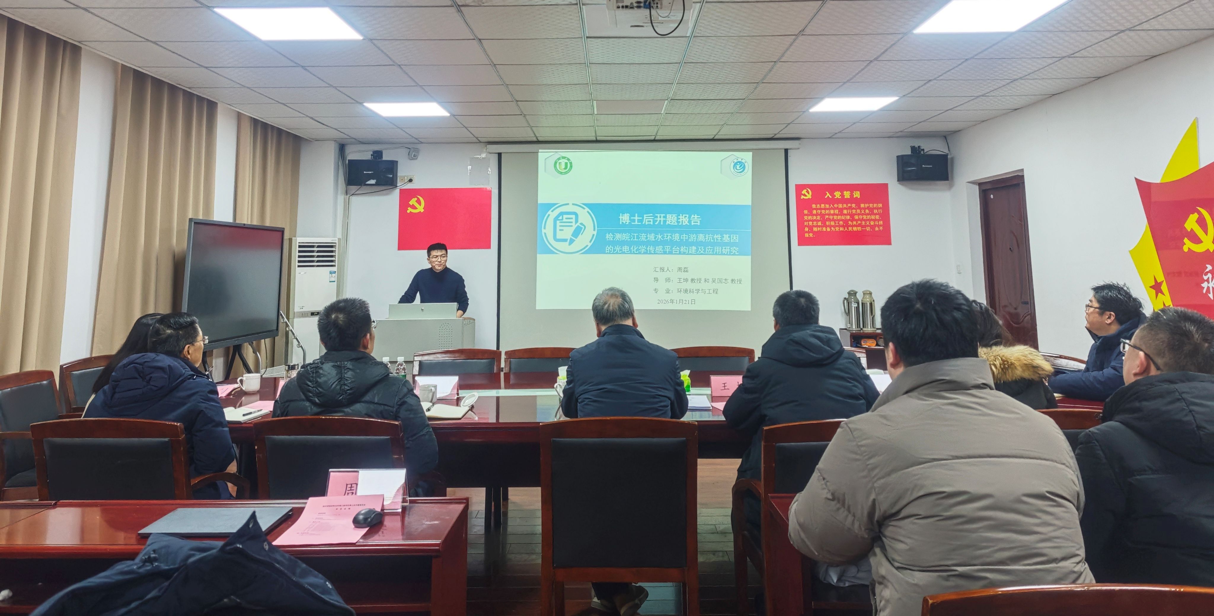1月21日,我校首位海外全职博士后开题报告会在逸夫南楼会议室举行。校党委委员、副院长吕刚,东南大学刘松琴教授、江苏大学王坤教授、池州市人才工作局局长林贤中、池州市人力资源和社会保障局副局长刘慧等专家领导出席会议。