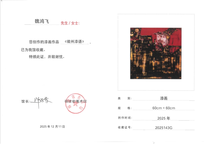 近日,我校艺术与教育学院魏鸿飞教授的漆画作品《徽州漆语》被福建省美术馆收藏。该作品曾于2025年8月入选“中国美协艺委会学术研究展系列:第三届小幅漆画展”。