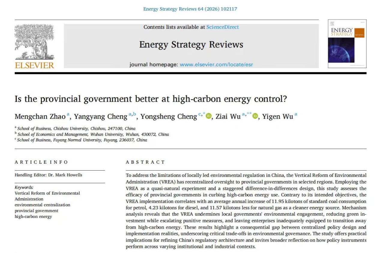 近日,我校赵梦婵博士团队在国际能源领域权威期刊《Energy Strategy Reviews》(SCI一区,影响因子11.4)发表题为《Is the provincial government better at high-carbon energy control?》的学术论文。