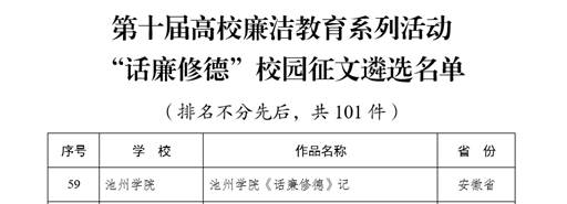 本次活动以“清风育德守初心,廉洁笃行担使命”为主题。自活动启动以来,学校党委高度重视,纪委精心统筹、广泛动员,广大师生积极响应、潜心创作,在校园内营造了崇廉、学廉、践廉的浓厚氛围。其中,体育学院创作的作品《池州学院〈话廉修德〉记》入选“话廉修德”校园征文遴选名单(该类别全国入选101件,安徽省入选9件);家风文化研究中心申报的池州家风文化馆入选“传廉促担当”廉洁文化地图素材遴选名单(该类别全国入选241件,安徽省入选5件)。