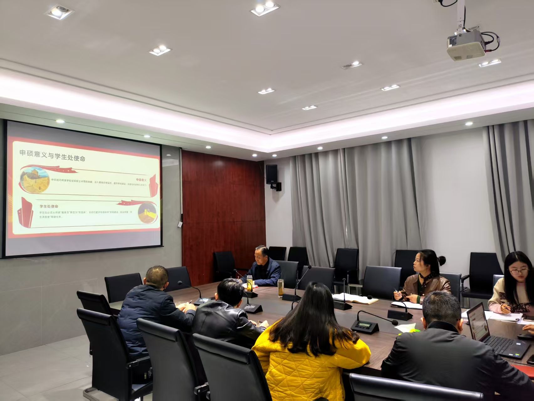 为深入学习贯彻党的二十届四中全会精神,锚定学校“申硕迎评”中心任务,11月6日,学生处党支部在易班会议室召开党员大会。全体党员参加,党支部书记洪为宝主持会议。